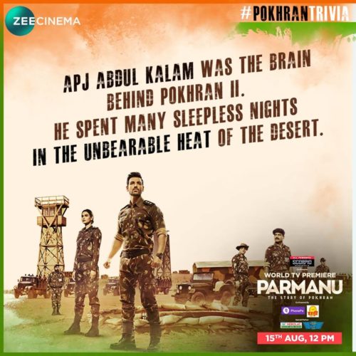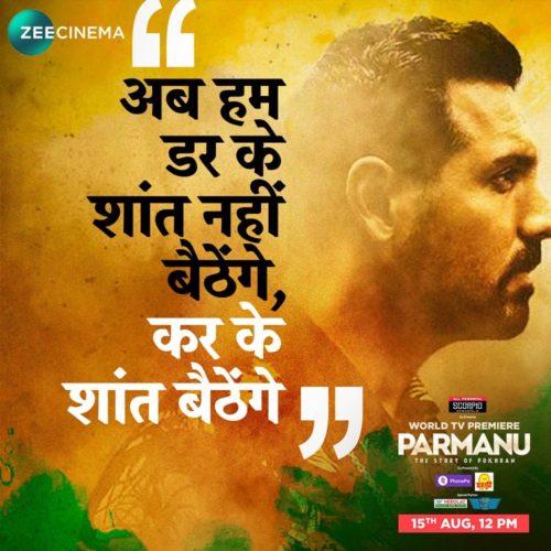 This Independence Day, let’s celebrate India’s journey in becoming a super-power country of the world!ย On August 15,ย 12 Noon, Zee Cinema brings to usย ‘India Ka Superpower Moment’ with the World T.V. Premier of Parmanu: The Story of Pokhran